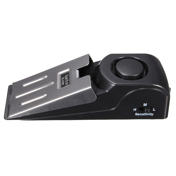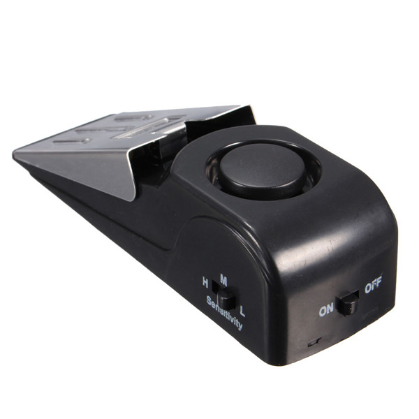 Wedge-shaped design alarm stops intruder from opening door. Adjustable sensitivity switch prevents tampering.